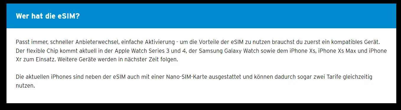 Noch unterstützen nicht alle deutschen Anbieter die eSIM. Bei einigen ist sie vorerst nur als Zweitkarte nutzbar. Auch wir arbeiten natürlich bereits daran, dir unsere günstigen Tarife auch als eSIM zur Verfügung zu stellen, voraussichtlich ab dem 2. Halbjahr 2019 kannst du zu deinen bestehenden Verträgen eine eSIM bestellen bzw. die eSIM bei Vertragsabschluss anstelle der klassichen SIM-Karte auswählen.