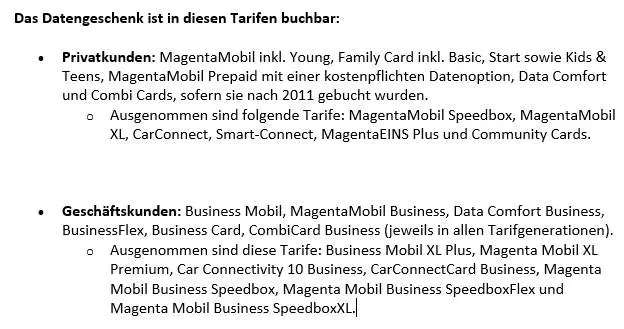 Bei der Telekom profitieren alle neueren Postpaid Tarife von dieser Aktion. Prepaid Tarife sind nur mit eingeschlossen, wenn man eine kostepflichtige Datenoption dazu bucht. Nutzer von Drittanbietern mit D1 Netz Mobilfunk-Tarifen sind leider nicht mit eingeschlossen, die kostenlosen 100 Gigabyte Datenvolumen gibt es nur für originale Kunden der Telekom. Die Aktion bei der Telekom startet am Montag, den 7. Dezember.