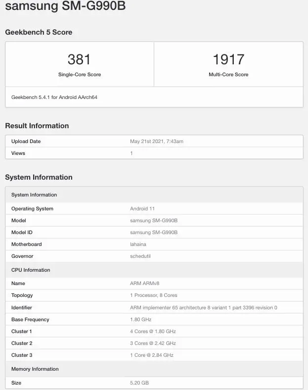 Laut der Geekbench-Liste wird das Samsung Galaxy S21 FE (SM-G990B) mit dem Chipsatz Lahaina geliefert, dem Codenamen für Snapdragon 888. Dies bedeutet, dass das Galaxy S21 FE ein Flaggschiff wie das Vanilla Galaxy S21 sein wird. Wir können auch erwarten, dass das Galaxy S21 FE mit Snapdragon 888 in Indien auf den Markt kommt. Die Geekbench-Liste zeigt auch, dass das Telefon mit 6 GB RAM und Android 11 ausgeliefert wird.
