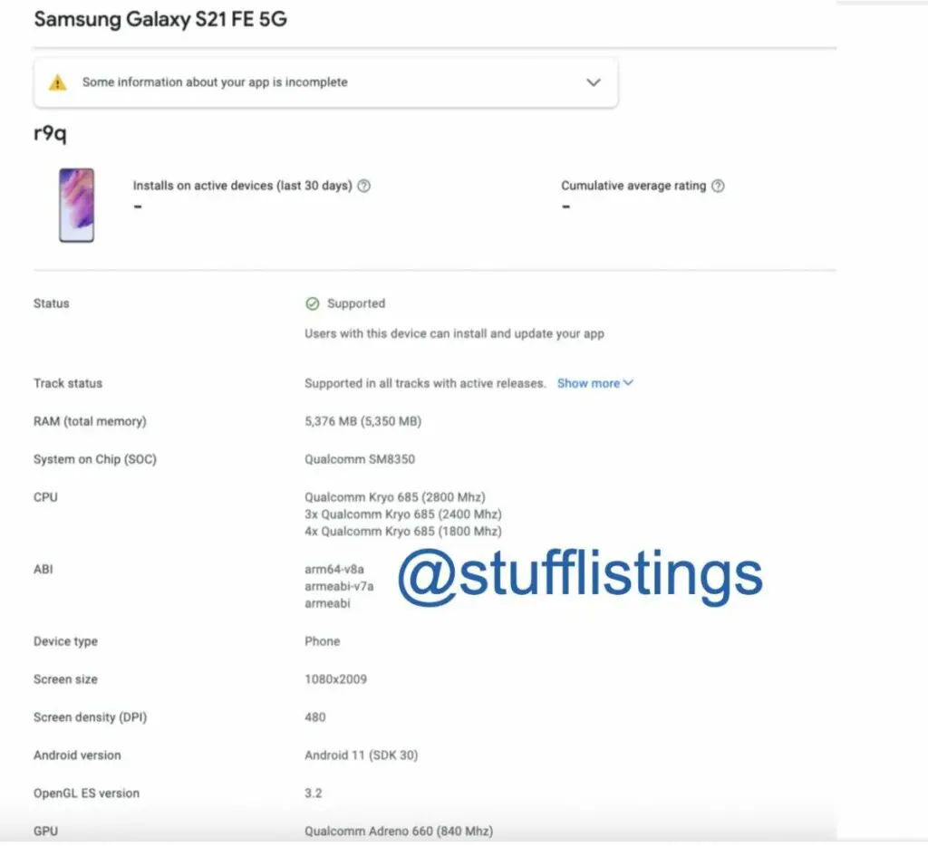 Google listet die neuen Galaxy S21 FE Modelle bereits in der Play Console unter den unterstützen Geräten und damit gibt es Details zur Technik der neuen Smartphones. Damit bestätigt sich der Snapdragon 888 Prozessor, es gibt 6 Gigabyte RAM und Android 11 von Haus aus. Das Display hat eine Größe von 1080×2009 Pixeln und eine Pixeldichte von 480 DPI