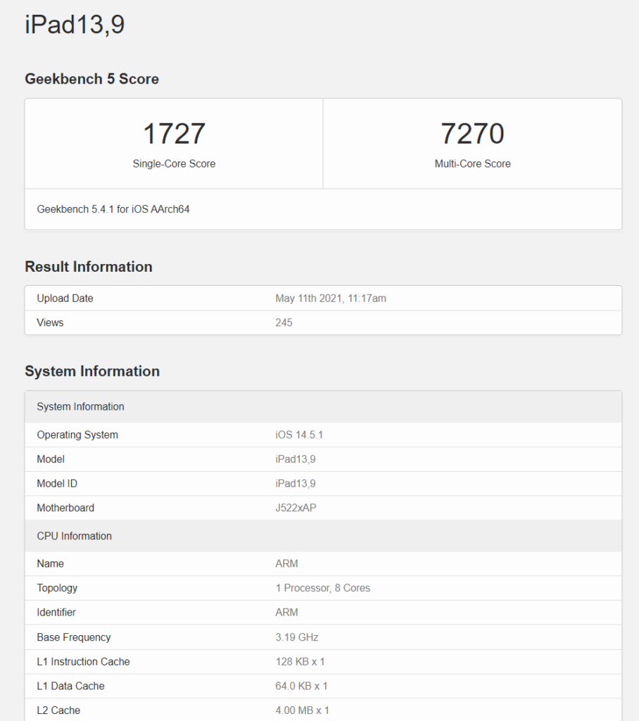 Es ist erwähnenswert, dass das 12,9-Zoll-iPad Pro der dritten Generation mit dem A12X-Chip einen höheren durchschnittlichen Multi-Core-Wert von 4.809 aufweist, was wahrscheinlich auf statistische Abweichungen zurückzuführen ist. Dies führt jedoch immer noch dazu, dass das M1 iPad Pro 51% schneller ist Laut Apples Marketing-Behauptung ist das M1 iPad Pro bis zu 50% schneller als die vorherige Generation.