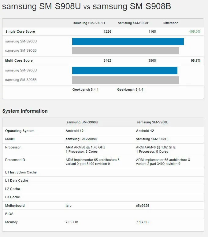 Tatsächlich sind die Benchmark-Ergebnisse des S22 Ultra mit Exynos 2200 und denen mit Snapdragon 8 nahezu identisch, wie Sie unserem Schnappschuss oben entnehmen können, was darauf hindeutet, dass Sie mit dem S22 Ultra nichts falsch machen können, egal welchen Chipsatz Samsung herausbringt in Ihrem Markt mit. Nimmt man jedoch nicht den SM-908U-Lauf mit der höchsten Punktzahl, erzielt das Exynos-2200-Modell des S22 Ultra im Durchschnitt höhere Benchmark-Ergebnisse als das Snapdragon-8-Modell.