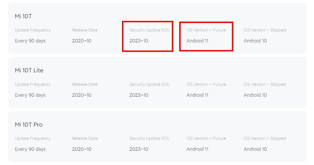 Xiaomi Mi 10T – Sicherheitsupdates bis Oktober 2023 – Die Xiaomi Mi 10T Modelle sind bei den Xiaomi Updates bei den vierteljährlichen Updates mit aufgeführt, aber wie lange das Unternehmen Sicherheitsupdates liefern wird, war vielen Nutzern nicht bekannt. Nun hat Xiaomi auch dazu Daten geliefert. Auf einer Unterseite listet das Unternehmen die Android Versionen für die aktuellen Modelle auf, die im Google Enterprise Programm genutzt werden können. Das bedeutet nicht, dass man diese Geräte auch als Enterprise Version nutzen muss, aber sie erfüllen zumindest die Voraussetzungen dazu und das bedeutet auch Transparenz bei der Versorgung mit neuer Software.