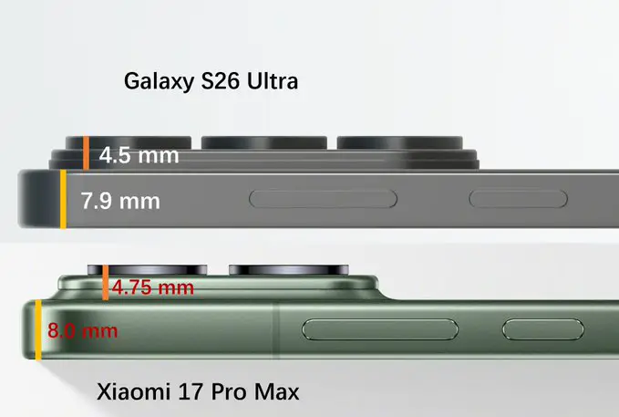 Samsung steht mit dem Galaxy S26 Ultra vor einem Zielkonflikt zwischen Design und Funktionalität. Die auffällige Kameraerhebung bietet zwar Platz für ein leistungsstarkes 5x-Periskopobjektiv, doch die technischen Daten bleiben hinter der Konkurrenz zurück. Im Vergleich zum Xiaomi 17 Pro Max (50 MP GN8, 1/1.95″, F2.6) nutzt Samsung lediglich einen kleineren IMX854-Sensor (50 MP, 1/2.52″, F2.9). Auch die Ultraweitwinkelkamera zeigt schwache Werte, beansprucht jedoch überproportional viel Raum. Xiaomi hingegen integriert diese platzsparend im Gehäuse. Die starke Auswölbung des S26 Ultra führt zu Instabilität auf ebenen Flächen und wirkt unausgewogen. Angesichts der sinkenden Attraktivität und der wachsenden technischen Lücke sollte Samsung seine Kamerastrategie überdenken. Design allein reicht nicht mehr aus, so der Leaker.