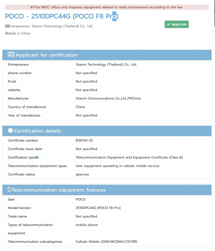 UPDATE Das POCO F8 Pro steht offenbar kurz vor seiner offiziellen Markteinführung. Das kommende Smartphone-Modell hat kürzlich die NBTC-Zertifizierung in Thailand erhalten – ein wichtiger Schritt, der auf eine baldige Markteinführung hindeutet. Die Zertifizierung bestätigt nicht nur die Existenz des Geräts, sondern deutet auch darauf hin, dass POCO die letzten regulatorischen Hürden für den Verkaufsstart nimmt. Weitere Details zu den technischen Spezifikationen oder dem genauen Veröffentlichungsdatum stehen derzeit noch aus.
