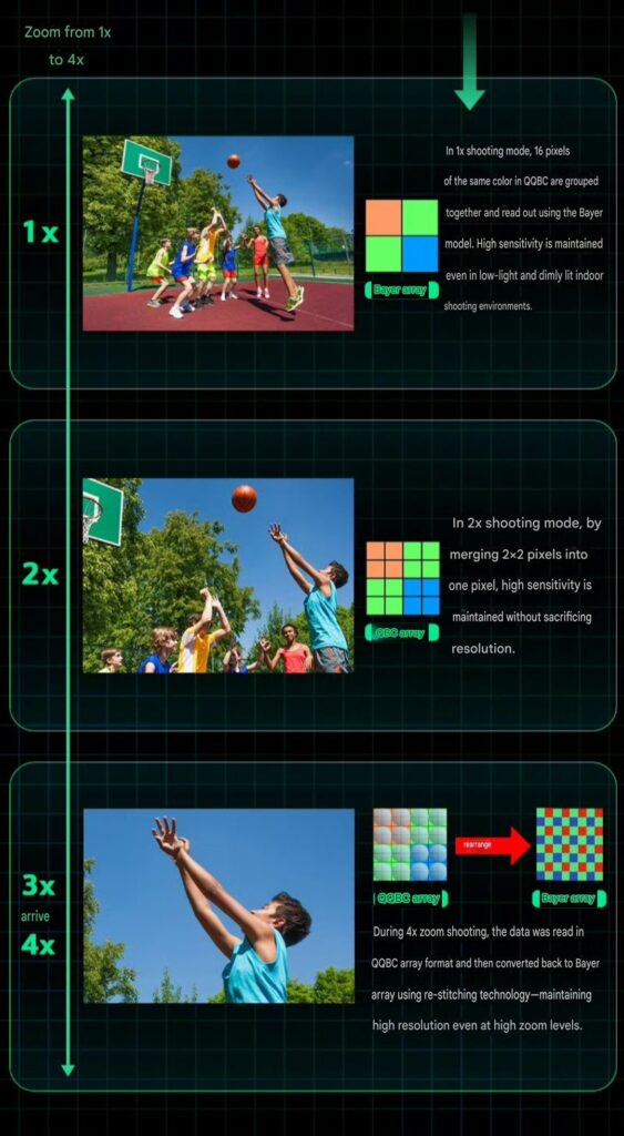 Herzstück des Sensors ist die neue Quad-Quad Bayer Coding (QQBC)-Struktur. Sie wird durch AI-basiertes Remosaicing direkt im Sensor ergänzt. Praktisch bedeutet das: Selbst bei bis zu 4-fachem Zoom mit nur einer Kamera bleiben die Aufnahmen scharf und detailreich.