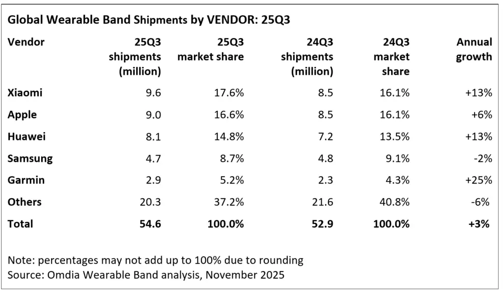 Der weltweite Markt für Wearable-Bänder verzeichnete im dritten Quartal 2025 ein moderates Stückzahlenwachstum von 3 Prozent auf insgesamt 54,6 Millionen ausgelieferte Geräte. Trotz des geringen Volumenanstiegs stieg der Marktwert jedoch deutlich um 12 Prozent auf 12,3 Milliarden US-Dollar. Laut aktueller Analyse von Omdia spiegelt dies den klaren Trend zu höherpreisigen, funktionsstarken Geräten wider.