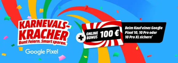 Die fünfte Jahreszeit erreicht in der MediaMarkt Tarifwelt ihren Höhepunkt. Vom 10.02.2026 bis zum 24.02.2026 laufen die „Karnevalskracher“, doch pünktlich zum Wochenende hat der Händler noch einmal eine Schippe draufgelegt: Seit dem Abend des 20.02. gibt es für die brandneue Google Pixel 10 Serie einen zusätzlichen Online-Bonus in Höhe von 100 €!