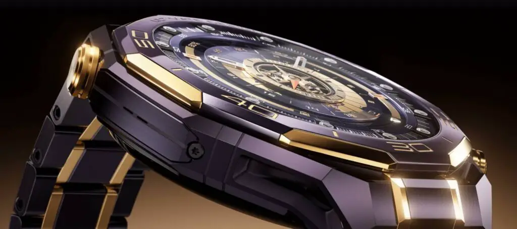 - Violette Keramik & Titan: Das Gehäuse besteht aus einer amorphen Legierung auf Zirkoniumbasis (besonders robust). Die Lünette ist aus violetter Nanokristall-Keramik gefertigt. Das Armband besteht aus Titan mit einer PVD-Gold-Beschichtung.