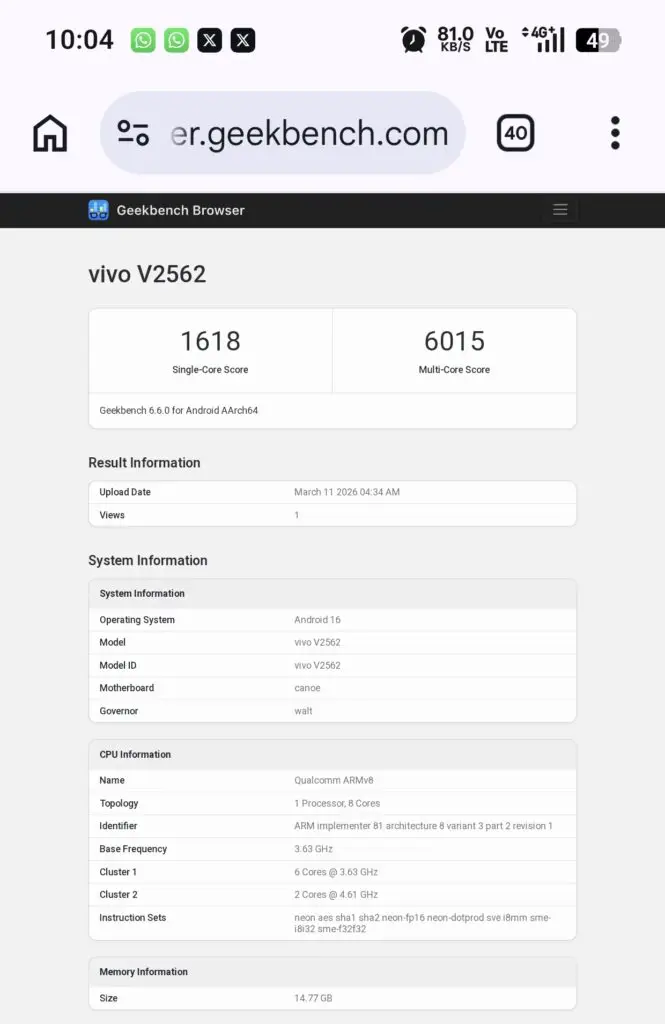 Wie viele Leaker bemerken, sind 1618 (Single-Core) und 6015 (Multi-Core) für diesen Chipsatz weit unter dem Potenzial. Zum Vergleich: Optimierte Snapdragon 8 Elite Gen 5 Chips erreichen normalerweise Werte von über 3.700 bzw. 11.000 Punkten.