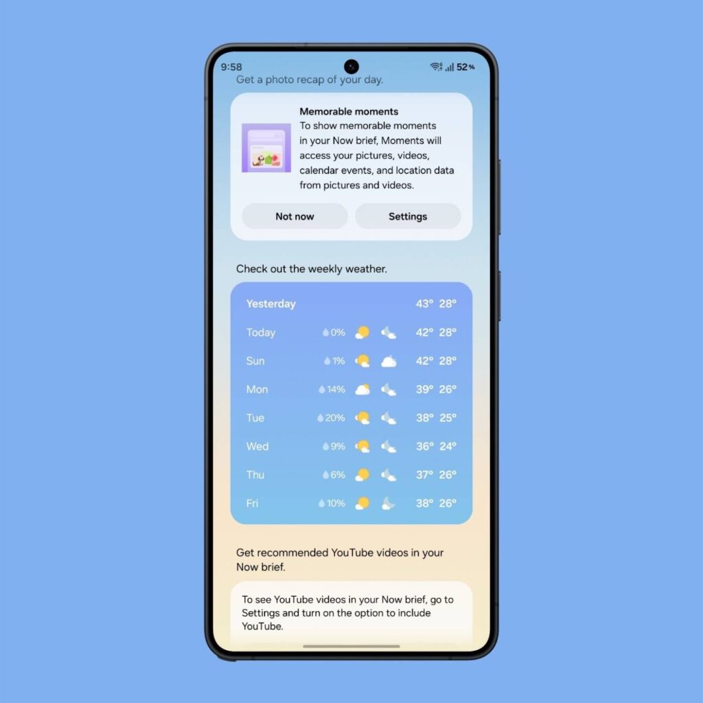- Intelligente Planungshilfen: Das System erkennt nun Zusammenhänge. Wenn für Donnerstag Regen gemeldet ist, gibt der Now Brief proaktiv den Hinweis, Outdoor-Aktivitäten eher auf den sonnigen Mittwoch vorzuziehen.