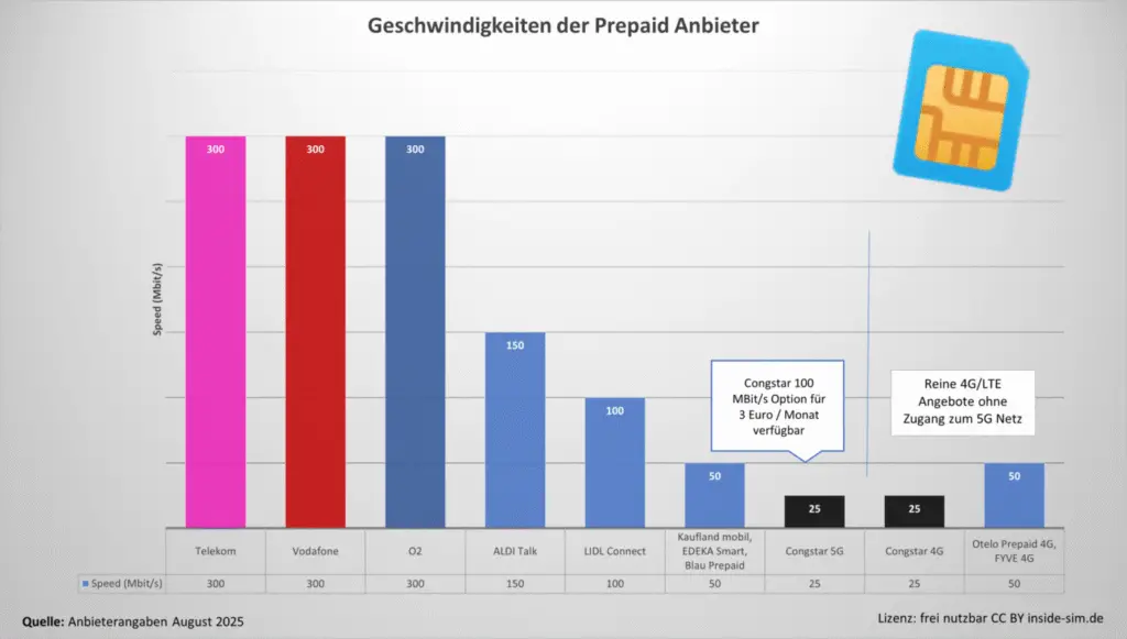 In der Grafik kann man aber dennoch gut erkennen, dass O2 nicht die schnellsten Prepaid Tarife auf dem Markt bietet (das ist die Vodafone Freikarte). Vor allem Telekom und Vodafone bieten noch mehr Speed, während die meisten Discounter deutlich langsamer sind. Dazu kommt, dass die 225Mbit/s bei O2 natürlich nur der maximale Wert sind und man in der Praxis oft deutlich langsamer surft. Hier macht sich der Netzausbau und die Auslastung des O2 Netzes bemerkbar.