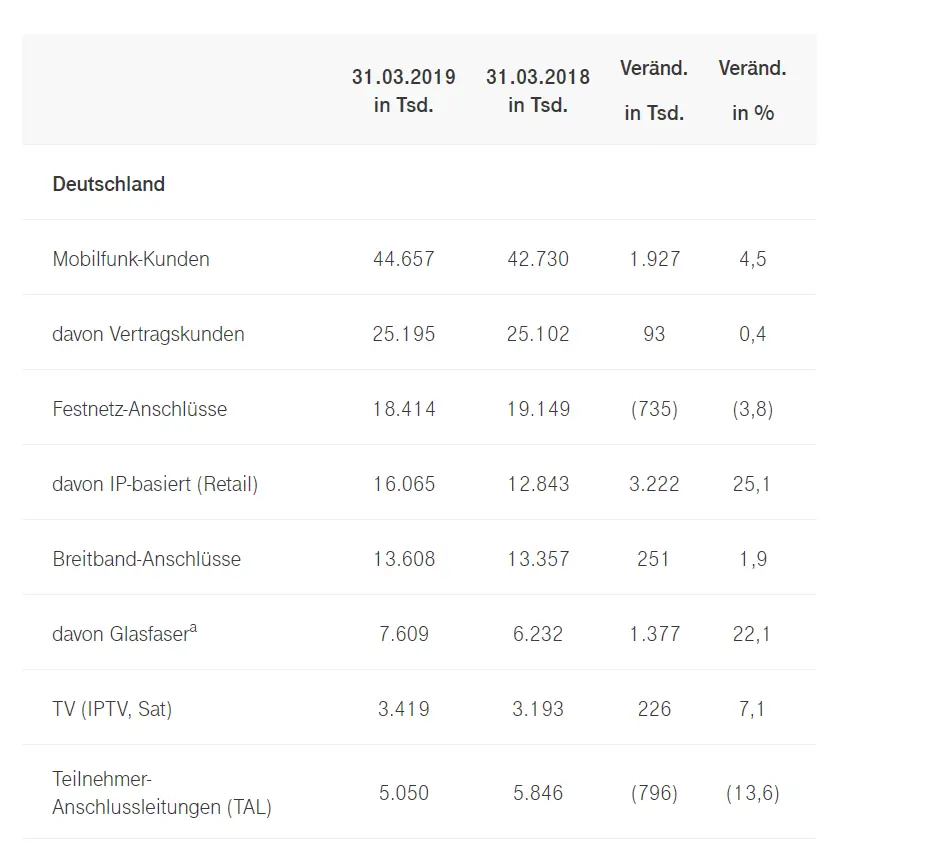 Bei den Kundenzahlen ist der Mobilfunk-Bereich besonders interessant, denn dort kann das Unternehmen in Deutschland die Zahl der Mobilfunk-Nutzer auf 44,657 Millionen steigern, dass sind 1,927 Millionen Kunden mehr als im Vorjahr im gleichen Zeitraum und damit baut das Unternehmen die Kundenbasis um 4,5 Prozent aus.