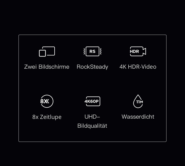 Bei der Technik hat die Kamera zwei Bildschirme, einen auf der Vorderseite und einen auf der Rückseite. So kann man sich sowohl selbst filmen und dies prüfen als auch normale Aufnahmen machen. Auch Sound und Sprache lässt sich über zwei eingebaute Mikrofone aufzeichnen. Dazu hat die Kamera auch eine Sprachsteuerung, damit man Aufnahmen auch dann machen kann, wenn man gerade keine Hände frei hat. Allerdings werden derzeit nur Kommandos in Englisch und Mandarin unterstützt, ob eine deutsche Version kommt, ist nicht sicher. Die meisten Nutzer werden mit der Sprachsteuerung in Englisch wohl aber keine Probleme haben.